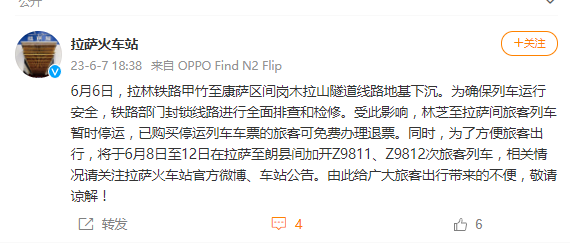 6月6日9时许,拉林铁路甲竹至康萨区间岗木拉山隧道线路地基下沉。为确保旅客列车安全,铁路部门立即启动应急预案,封锁线路进行全面排查。受此影响,6月6日林芝至拉萨的Z9807、Z9808次列车停运,已购买停运列车车票的旅客可免费退票。