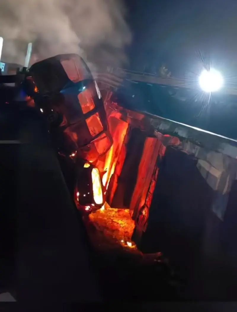 “桥梁坍塌现场,梁片的一头翘起来了,另一头落下去了。”高速交警介绍,事故现场,高速公路的路面与桥梁的伸缩缝之间,梁片翘起来的方向,出现了大约3米宽的缝隙,另外一端坠落下去。事发时,走在前面的一辆小轿车和紧跟其后的一辆面包车跌入缝隙,很快起火。当高速交警赶到现场时,两台车辆均已被烧毁。