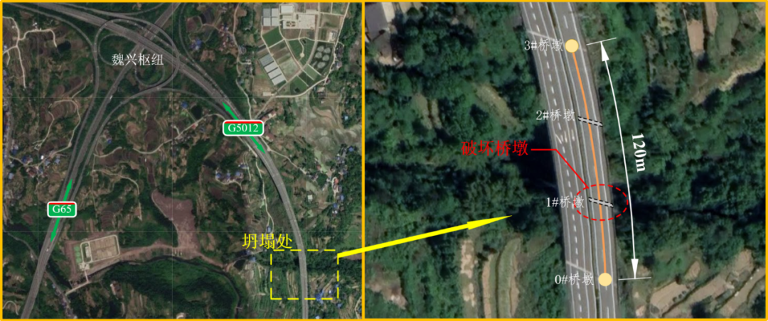 事故桥梁位于G5012恩广高速达万段万州至达州方向K230+679处,于2012年12月18日建成通车,详细桥位情况如图所示。桥梁上部结构为斜交的双幅装配式简支T梁,下部结构为柱式墩,其中1#桥墩高度约为35m,跨径布置为3×40m,如图2所示。