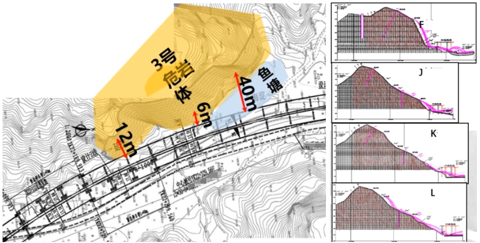 某特大桥桥位范围内共存在4处危岩体,其中1、2号危岩体对本工程影响较小,3、4号危岩体距离桥位较近,施工及运营期存在较大安全隐患。如图8所示。
