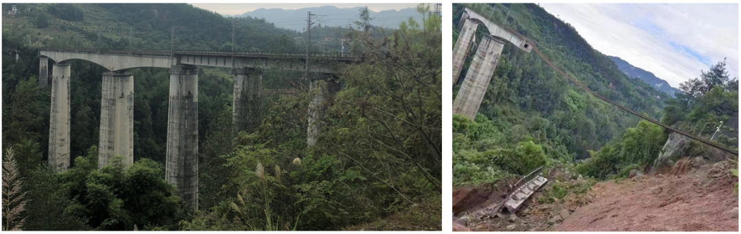 2023年7月4日上午,万凉铁路鱼背山站至罗田站间驷步河铁路桥部分桥墩倒塌,引起铁路桥梁部分垮塌,如图10所示。目前,途经该区段的列车已被安排迂回、折返或停运,桥梁坍塌未造成人员伤亡。