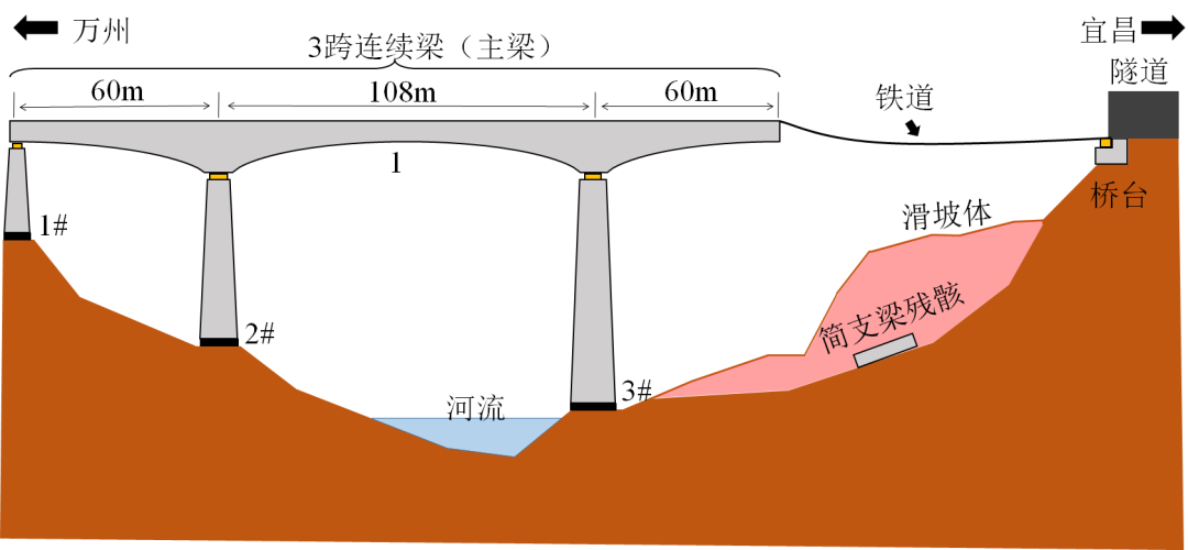 驷步河铁路桥为单线桥,位于万凉铁路鱼背山站至罗田站间。根据相关资料,全桥长375.45m,桥跨组合为3×24+1×32+60+108+60+1×32m,共8孔,桥底部宽约60米,主桥墩高105.3米,桥高113m。事故段由三跨连续梁的主桥部分及4跨简支预制T梁桥引桥部分组成,详细桥位及桥梁信息如图图11所示。