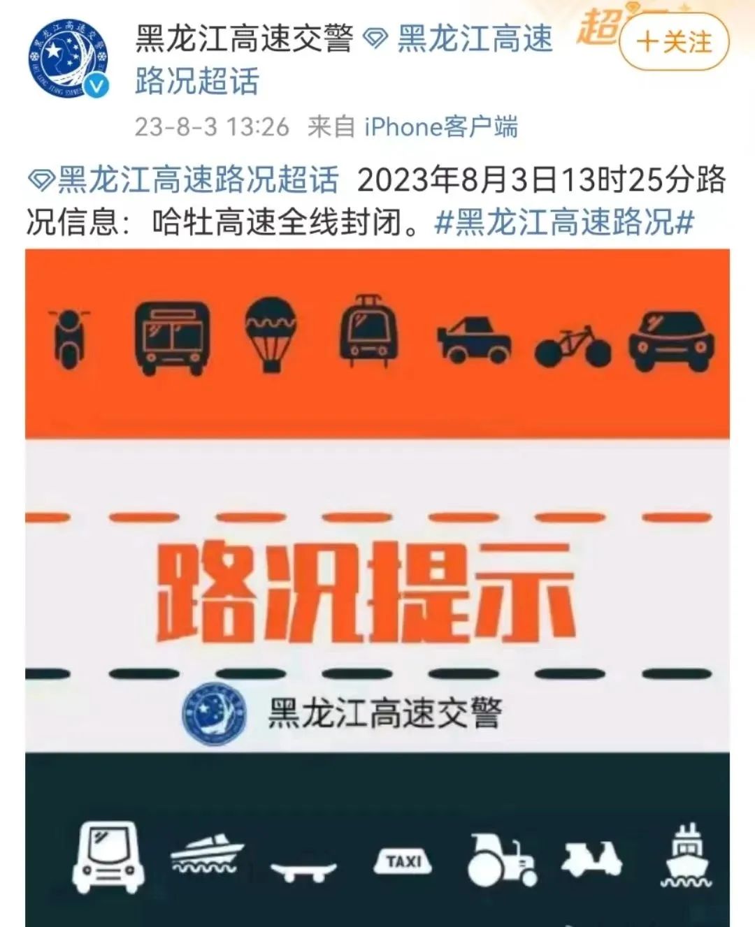 另据黑龙江省公安厅高速公路交通管理局消息,目前,哈牡高速235公里处往牡丹江方向应急车道和行车道发生路面塌陷,303公里处发生漫水,315公里处桥梁有坍塌风险,另有多处路段积水较多。