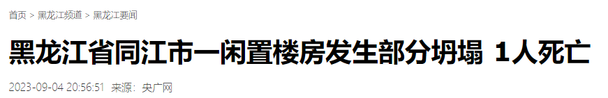记者从黑龙江省同江市委宣传部获悉,2023年9月4日下午15时7分, 黑龙江省同江市幸福路625号一3层楼房发生部分坍塌事件。经初步了解,此楼为闲置楼房,砖混结构,建筑面积1941.31平方米,经核实1人被困,被困人员救出后送往医院,经抢救无效死亡。事件原因正在调查中。