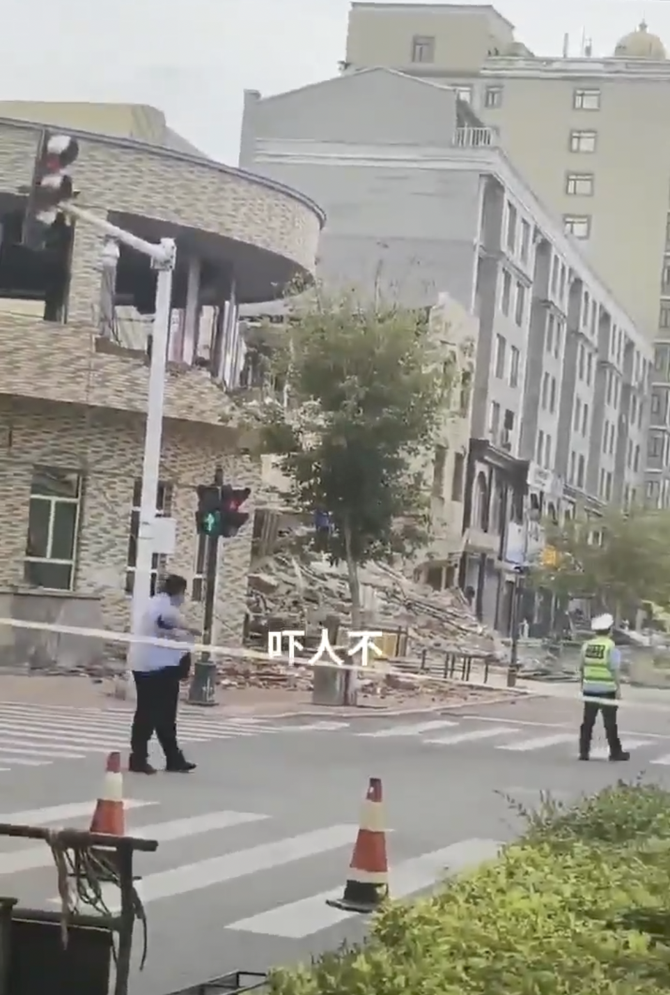 佳木斯一栋三层宾馆倒塌,周围有警察维持秩序。图/视频截图
