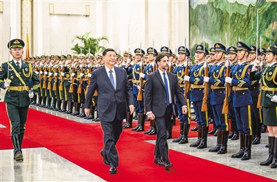 十一月二十二日下午,国家主席习近平在北京人民大会堂同来华进行国事访问的乌拉圭总统拉卡列举行会谈。这是会谈前,习近平在人民大会堂北大厅为拉卡列举行欢迎仪式。
