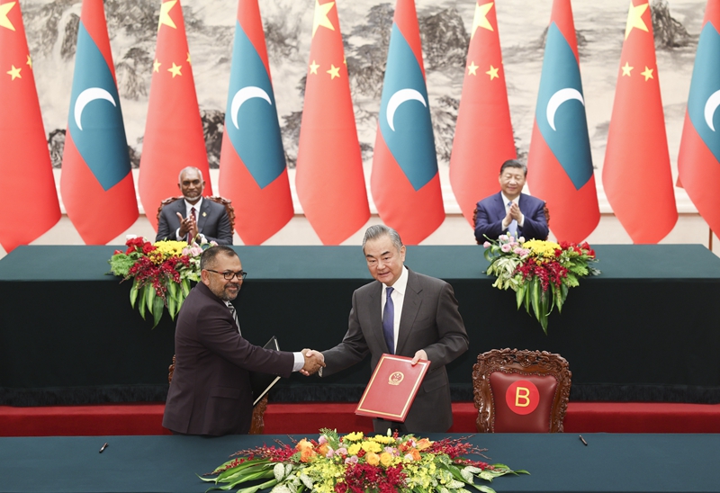 1月10日下午,国家主席习近平在北京人民大会堂同来华进行国事访问的马尔代夫总统穆伊兹举行会谈。这是会谈后,两国元首共同见证签署双边合作文件。新华社记者 丁海涛 摄