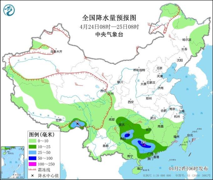 其中今天白天至夜间,贵州中东部、广西东北部、广东中西部等地部分地区有大到暴雨,局地大暴雨;上述部分地区伴有短时强降水(最大小时降雨量30~50毫米,局地可超过60毫米)、局地雷暴大风、冰雹等强对流天气;明天(25日)是本轮强降雨的最强时段,广西东北部、广东中北部等地部分地区有暴雨或大暴雨(100~180毫米);后天起(26日),强降雨范围收缩。