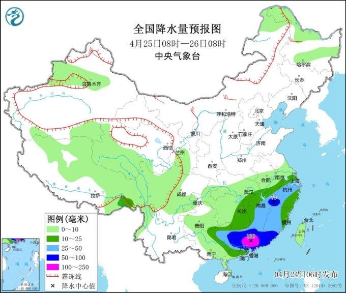 据中央气象台网站消息,中央气象台**预报显示,预计未来三天(24-26日),江南、华南及贵州中东部等地将再度出现强降雨,广东、广西、福建、浙江、江西、贵州等地的部分地区将有大到暴雨,并伴有雷暴大风、冰雹等强对流天气;强降雨中心位于广西东北部至广东中部一带,局地累计降雨量可达250~300毫米。