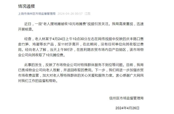江西省上饶市信州区市场监督管理局4月26日发布情况通报称,近日,一段“老人摆地摊被收10元地摊费”视频引发关注。信州区市场监督管理局高度重视,迅速开展核查。