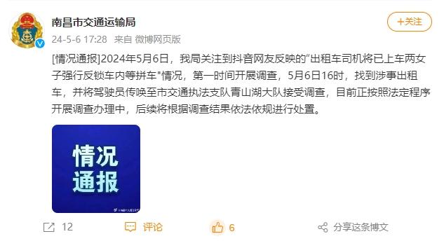 江西省南昌市交通运输局6日通过官方微博发布情况说明称,2024年5月6日,南昌市交通运输局关注到抖音网友反映的“出租车司机将已上车两女子强行反锁车内等拼车”情况,**时间开展调查,5月6日16时,找到涉事出租车,并将驾驶员传唤至市交通执法支队青山湖大队接受调查,目前正按照法定程序开展调查办理中,后续将根据调查结果依法依规进行处置。