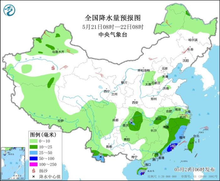 5月21日08时至22日08时,新疆西北部、重庆中东部、湖北西南部和东部、贵州东北部、湖南西北部、江西东部、浙江中南部、福建、广东中东部、云南南部、海南岛、台湾岛等地的部分地区有中到大雨,其中,海南岛东南部、广东东部沿海、福建南部沿海的部分地区有暴雨或大暴雨(100~150毫米)。新疆北部和东部、甘肃西部、内蒙古中部和东北部、吉林中部、辽宁、浙江等地的部分地区有4~6级风,其中,新疆北部和东部的部分地区阵风7~8级,山口风力可达9级以上;东海北部和南部海域有5~7级、阵风8级的偏东风。此外,新疆南部和东部、甘肃西部等地的部分地区有扬沙或浮尘。