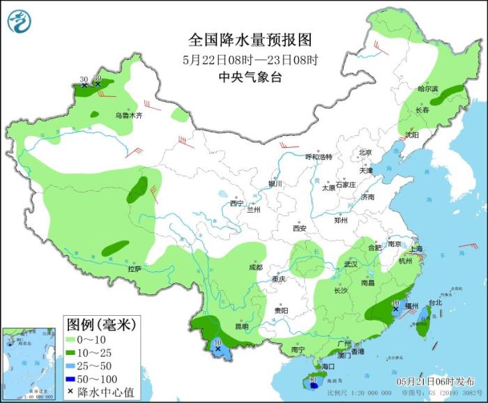 5月22日08时至23日08时,新疆西北部、黑龙江东南部、吉林中东部、云南南部、广东南部沿海、福建大部、海南岛、台湾岛等地的部分地区有中到大雨,其中,海南岛中南部局地有暴雨(50~90毫米)。新疆沿天山地区和南疆盆地、甘肃西部、青海西部、内蒙古中部和北部、辽宁、浙江等地的部分地区有4~6级风,其中,甘肃西部局地风力可达7级以上。东海北部海域有5~7级、阵风8级的偏东风。