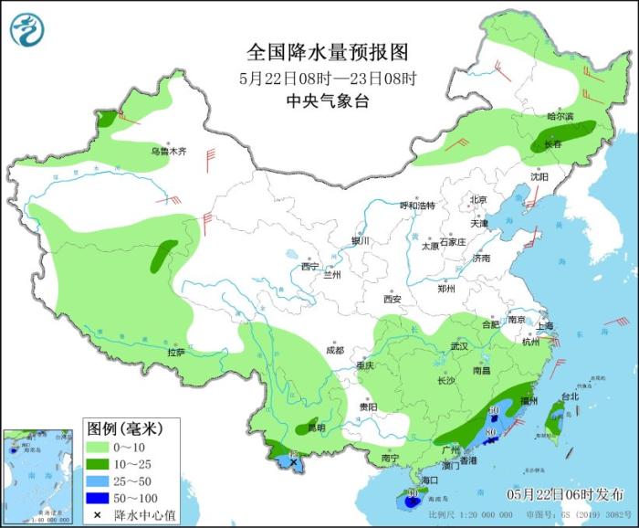 5月22日08时至23日08时,福建、江西南部、广东中东部、海南岛以及吉林中部、云南南部等地的部分地区有中到大雨,其中,福建南部、广东东部、海南岛中东部等地局地有暴雨(50~90毫米)。新疆沿天山地区和南疆盆地东部、甘肃中西部、宁夏、陕西北部、内蒙古、东北地区、山东半岛、浙江等地的部分地区有4~6级风;东海北部海域将有5~7级、阵风8级的偏东风。