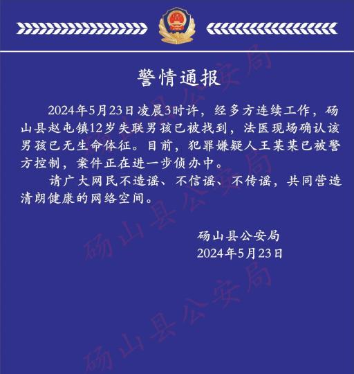 合肥5月23日电 安徽省砀山县公安局23日发布警情通报称,5月23日凌晨3时许,经多方连续工作,砀山县赵屯镇12岁失联男孩已被找到,法医现场确认该男孩已无生命体征。目前,犯罪嫌疑人王某某已被警方控制,案件正在进一步侦办中。