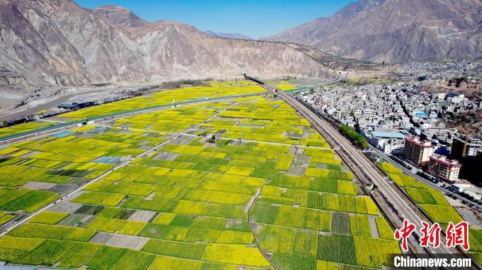甘肃陇南市,高速公路与铁路宛如两条并行的动脉,穿梭在金黄色的油菜花田间。