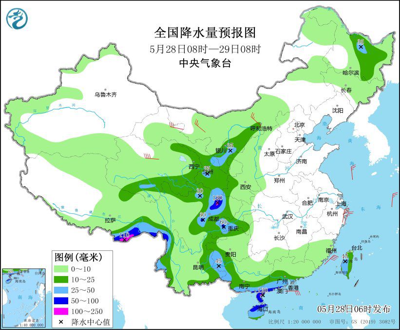 5月28日8时至29日8时,广西南部和西部、广东西南部、海南岛、贵州西南部、云南东部和西北部、四川盆地西部、重庆西部、甘肃南部、宁夏中部、黑龙江北部、西藏东南部以及台湾岛西部等地的部分地区有大到暴雨,其中,广东西南部、海南岛北部、四川盆地西北部、西藏东南部等地局地有大暴雨(100~120毫米)。新疆沿天山地区及南疆盆地、内蒙古中西部、甘肃西部、浙江等地的部分地区有4~6级风,其中,浙江东部沿海地区等地的部分地区风力可达7级以上;东海大部、台湾海峡、台湾以东洋面、南海东北部海域有6~7级、阵风8级的偏东到东北风。