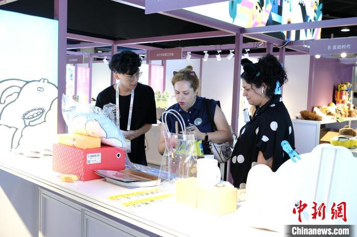 台湾漫画家杨闵翔(左一)正在向海外游客介绍其创作的动漫形象“丑白兔”。曹丹摄