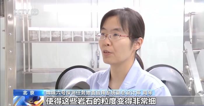 嫦娥六号探测任务地面应用系统副总设计师 周琴:铲取获得的样品,不光细,而且颜色非常深,是因为月球表面长时间遭受了一些太空风化作用,经历了多次撞击事件的影响,反复破碎、撞击冲击作用使得这些岩石的粒度变得非常细,它的平均粒径大概只有50微米左右,跟面粉粒度粗细差不多相当。