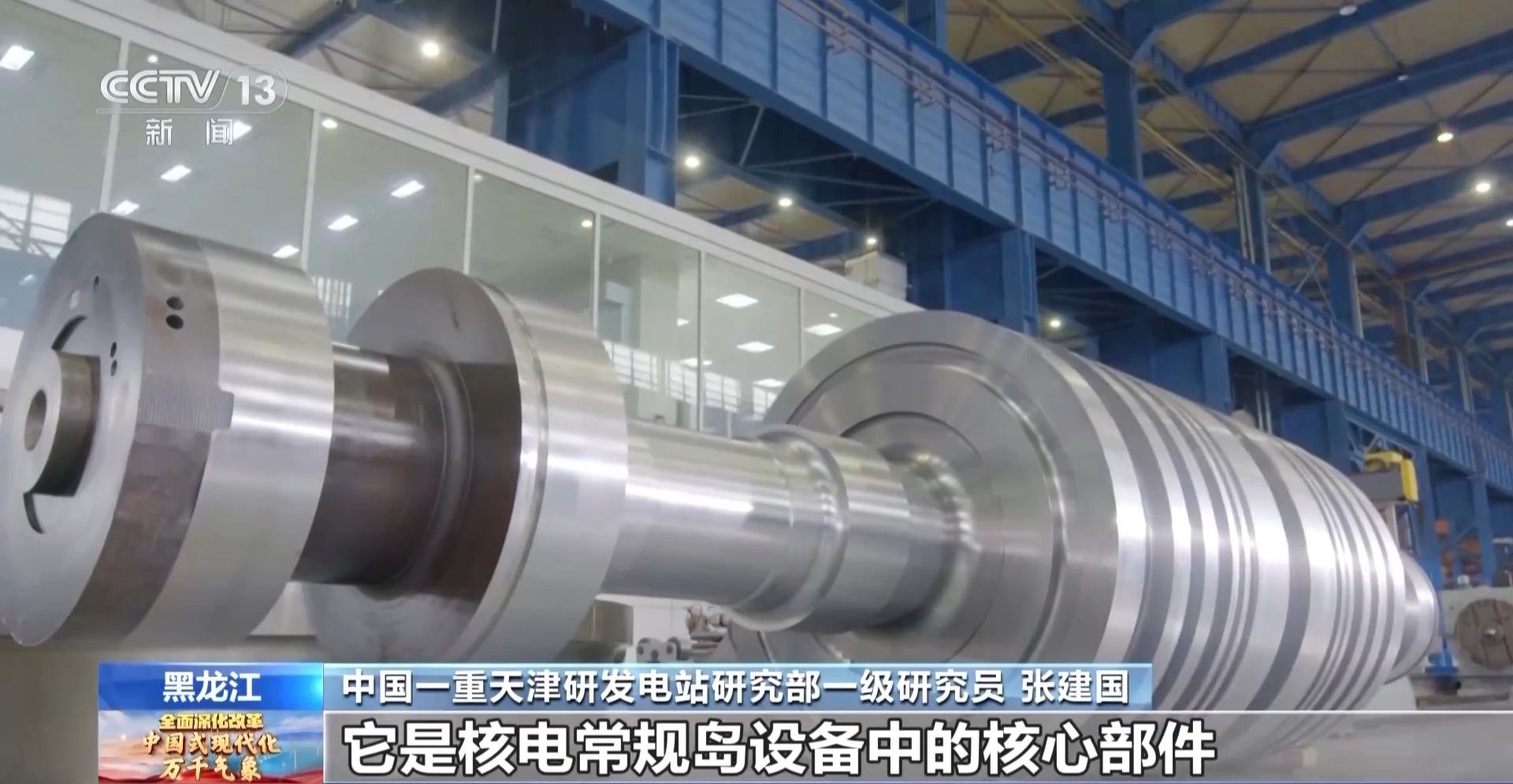 中国一重天津研发电站研究部一级研究员 张建国:它是核电常规岛设备中的核心部件,整体锻造,没有焊缝,它的内部要求,打个比方,相当于我们在一个100平方米的房子中充满面粉,但是不允许存在米粒大小的杂质,现在世界仅有几个国家可以进行生产,我们经过技术攻关,掌握了这个核心制造技术,单支转子可以节约外汇成本50%以上。