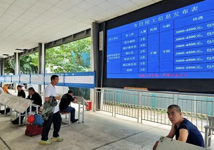 6月17日,成都锦江区人力资源市场,一块大屏幕滚动播放着企业招工信息,大屏幕两旁的公告栏张贴着企业的招工启事。