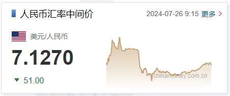 7月26日电 据中国外汇交易中心网站消息,中国人民银行授权中国外汇交易中心公布,2024年7月26日银行间外汇市场人民币汇率中间价为:1美元对人民币7.1270元,上调51个基点。