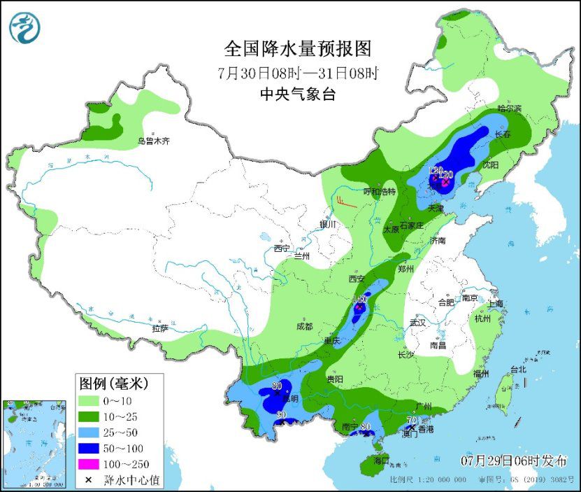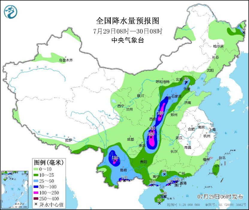 预计未来三天,我国南北方仍将有较强的降雨出现,华南南部、云贵高原、湖南西北部、重庆、湖北西部、陕西东部及华北、东北地区等地有大到暴雨,部分地区有大暴雨、局地特大暴雨。其中今天,湖北西部、湖南西北部、重庆大部、贵州东北部、四川东北部和南部、云南大部、广西南部、广东西南部、海南岛东北部和南部、陕西东南部、河南西部、山西中南部、河北中南部、北京东南部、天津中北部、黑龙江东北部等地有大到暴雨,重庆东部和北部、湖北西南部、陕西东南部、河南西部、山西西南部、云南北部和东南部、广西南部沿海、广东西南沿海等地部分地区有大暴雨,局地特大暴雨(250~260毫米)。