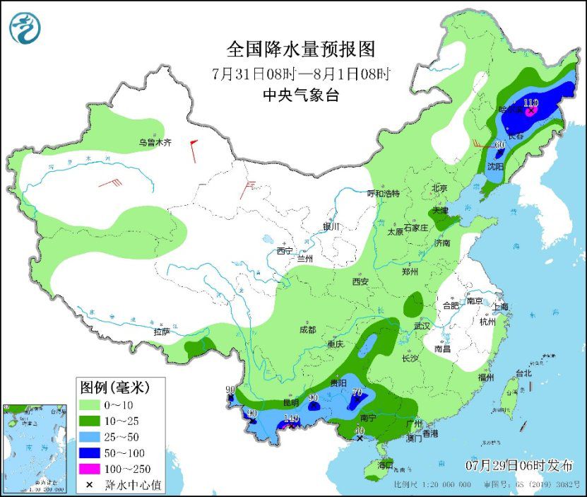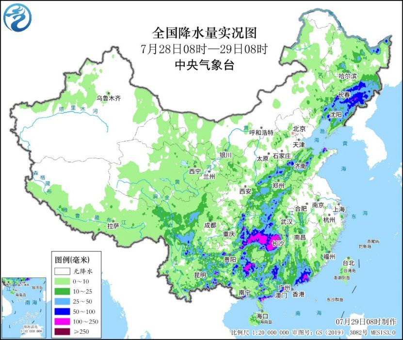 7月29日电 据中央气象台网站消息,昨日,强降雨仍在影响湖南、辽宁、吉林等地,监测显示,湖南中西部、湖北南部、重庆东南部、贵州东北部、广西北部、广东西北部和南部沿海、云南东南部和河南北部、山东中西部和半岛北部、辽宁中北部、吉林中东部等地部分地区出现暴雨或大暴雨,湖南怀化、长沙、邵阳、娄底和广东湛江、广西百色等局地特大暴雨(250~393毫米)。