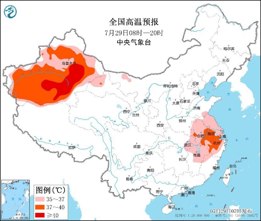 高温方面,预计未来10天,新疆盆地地区、内蒙古西部、甘肃西部、宁夏北部、黄淮南部、江汉、江淮、江南等地有7~10天日最高气温35~38℃的高温天气,部分地区最高气温有39~40℃,新疆盆地地区、内蒙古西部局地可达41~43℃。其中今天,安徽、江苏、湖北东部、江西北部、上海、浙江及新疆等地将有35℃以上的高温天气,新疆盆地局地可达40℃以上。公众需注意做好防暑降温措施。