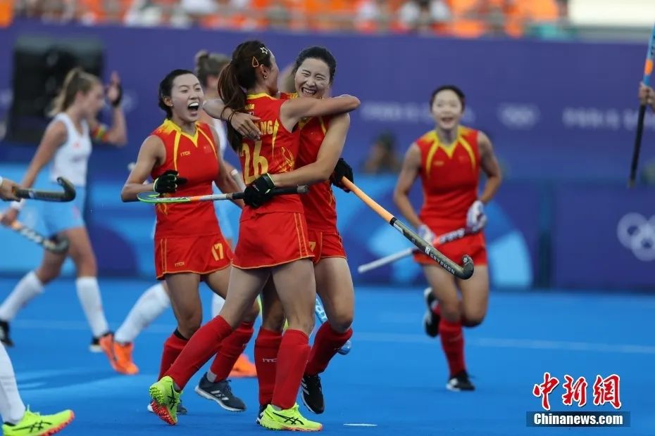 图为8月10日在巴黎奥运会女子曲棍球决赛中,中国队员相拥庆祝进球。