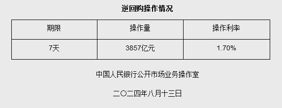 8月13日电 据央行网站消息,为维护银行体系流动性合理充裕,2024年8月13日人民银行以固定利率、数量招标方式开展了3857亿元逆回购操作。具体情况如下: