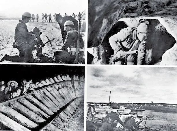 上图左:地雷战。上图右:地道战。   下图左:破袭战。下图右:水上游击战。新华社发