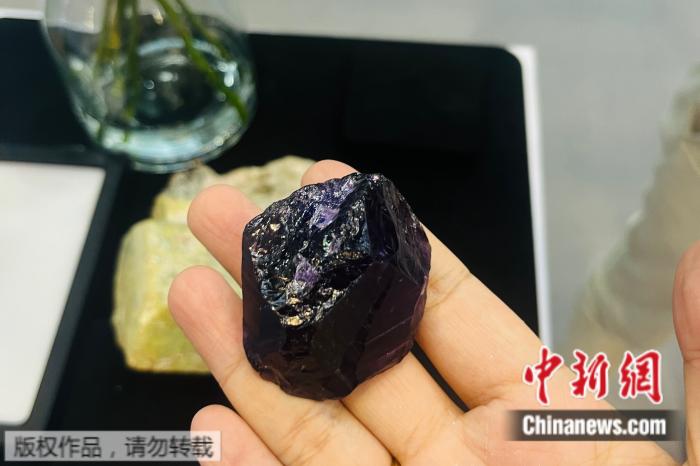 一进入展厅,赞比亚企业展台上一块晶莹的紫水晶原石,便吸引了众多参观者驻足。记者好奇地拿起这块沉甸甸的石头,用英文问道:“How much is it?(这块石头多少钱?)”令人惊讶的是,一位赞比亚小伙用流利的中文回应:“这个我们不单卖,在中国通常是批发的。这样一块大约值七、八万人民币。”