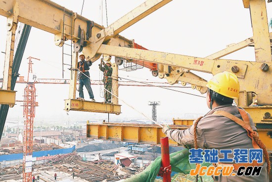 盐城范公路新洋港特大桥是苏中苏北城市范围内最大的斜拉桥,目前大桥南北主墩桩基、承台全部完成,塔身完成一半以上工程量,南主墩开始进入预应力连续箱梁挂篮施工。图为工人们正在安装左幅钢结构挂篮。