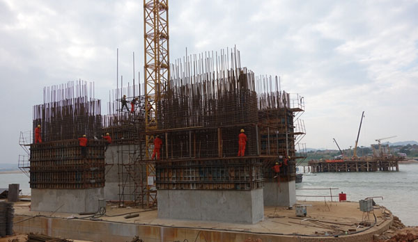 11月5日上午,在施工现场架设于河中心的8号和9号两个主墩的施工平台上,10台桩机同时运作,全力加快水下钻孔作业,推进桩基础施工;靠近两边河岸的7号和10号主墩已经完成桩基础和承台建设,进入水上墩身部分的钢筋捆扎和混凝土浇筑施工,几十名施工人员在多个工作面上分工忙碌,同时加快工作进度。