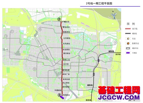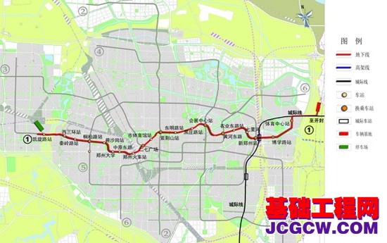 从2009年郑州市开始修建地铁到目前,在施的地铁线路为郑州地铁1号线一期工程和2号线一期工程。1号线一期工程为东西走向,西起凯旋路站,沿郑上路—建设西路—嵩山路——中原东路—火车站—正兴街—二七广场—人民路—紫荆山—金水路—会展中心—金水东路—东风东路—新郑州站—明理路,终点为体育中心站,线路全长26.2km,均为地下线,共设车站20座。2号线一期工程为南北走向,北起广播台站,向南途经新龙路站、国基路站、北环路站、东风路站、农业路站、黄河路站、东大街站、陇海东路站、帆布厂街站、航海东路站、长江路站、南环路站、向阳路站,止于南四环站,线路全长20.6km,均为地下线,共设车站16座。郑州地铁1号线一期工程和2号线一期工程线路分布示意图如图1.1和图1.2所示。