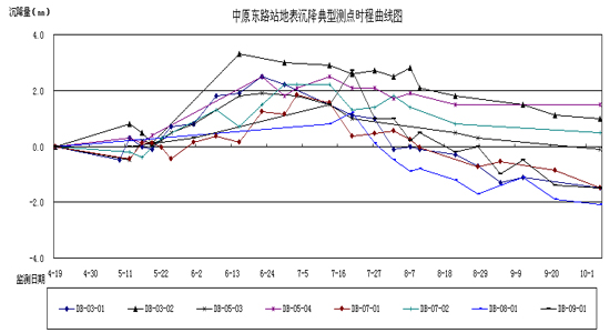 从曲线图可以看出,地处郑州南部的2号线一期向阳路站开挖过程中无地下水影响,围护结构桩变形大多在5mm以内。 从基坑开始开挖到结构封顶后的3个月,周边地表沉降依次出现缓慢沉降、明显沉降、趋于稳定、基本稳定等过程。