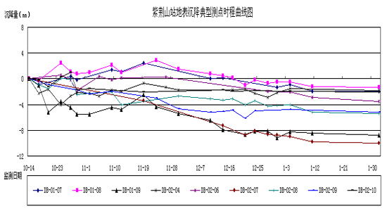 图4.2.1 紫荆山站地表沉降典型测点时程曲线图