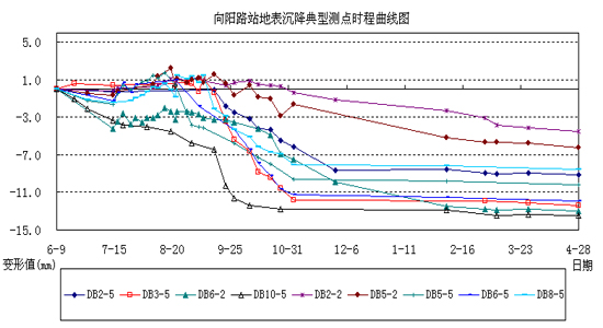 图4.5.1 向阳路站地表沉降典型测点时程曲线图