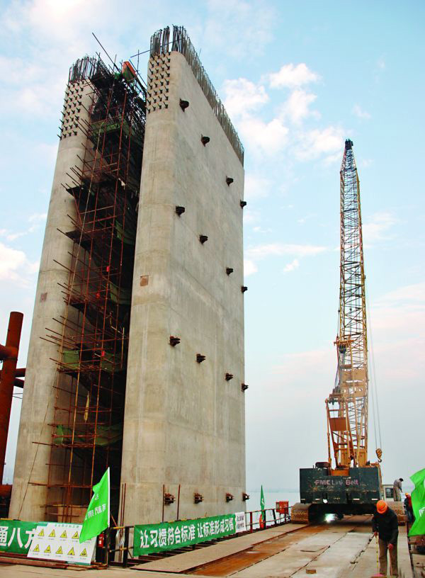 在阅江大桥建设现场,南侧39#主墩高高耸立起33米的墩柱,施工脚手架拆除接近尾声;一辆吊重100吨的大吊车已经进场,准备在主墩旁安装大型塔吊,为下一步施工做准备。
