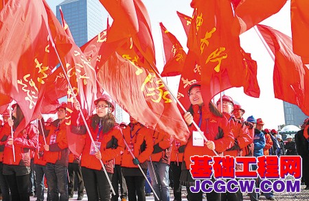 轨道交通3号线一期工程建设单位代表在天童路与鄞县大道交叉口的鄞县大道站点开工现场誓师。