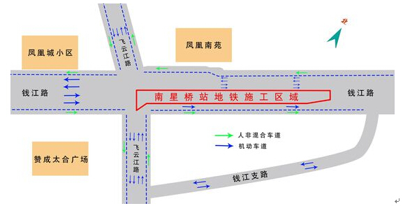 一期工程施工阶段,钱江路与飞云江路交叉口以西将维持原状6车道(2个东向西车道+2个西向东车道+2个左转向车道),与飞云江路交叉口以东,道路向北侧偏移,仍维持5车道(2个西向东车道+3个东向西车道),车道两侧各设人非混行道。