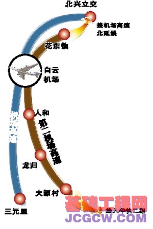 北段工程(北二环高速至机场高速北延线):起于花都区花东镇金港互通立交(接机场高速北延线),往南经花东镇东侧、机场规划区东侧,设短隧道下穿机场跑道导航设施区后设连接线对接机场T3航站楼,再跨越流溪河、经人和镇西侧、北二环高速,沿白云综合服务区规划区东侧,终于龙归镇西侧(接国道G106线),长约20公里,投资估算68亿元。
