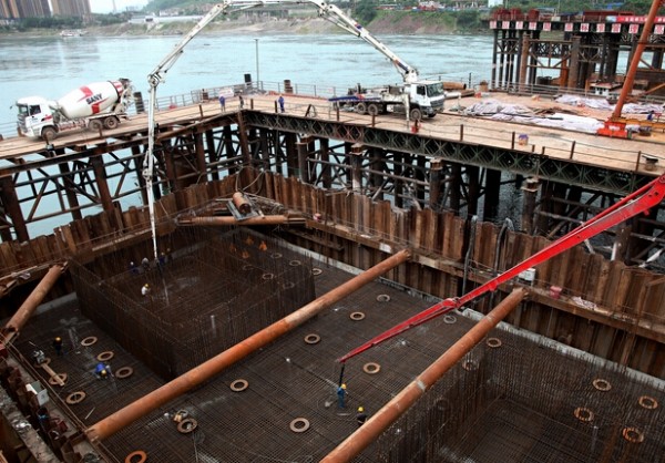 据承建金沙江公铁两用桥的中铁大桥局二分部项目部经理谢守杰介绍,宜宾金沙江公铁两用桥4号主墩是涉水的三个主墩之一,承台面积相当于两个半篮球场大小,高6米,采用钢板桩围堰施工。4号墩承台从5月10日晚上11时许开始灌注,历时73小时,混凝土灌注量达到6420方。该墩所处位置地质条件复杂,为密状卵石和砂层,下伏层层位不稳定,均匀性差,局部存在“孤石”,钢板桩围堰插打困难;且由于覆盖层较厚,承台封底混凝土标高均在河床面以下——局部深达7米之多(平均深度为5米),致使封底前清基工程量大,工期紧迫,是制约全桥工程进度的关键点之一。