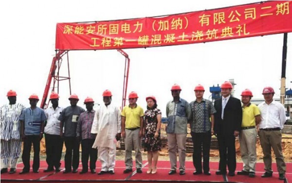 加纳时间5月15日上午, 葛洲坝集团基础工程有限公司承建的深能安所固电力(加纳)有限公司二期工程a标动力岛项目第一仓混凝土顺利开仓浇筑。中国驻加纳大使孙保红女士及加纳能源部部长、深能安所固电力(加纳)有限公司董事长李晓海等相关单位领导出席典礼仪式。