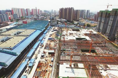 5月19日,济南火车站北广场地下工程主体已经超过地面,工人开始地面部分施工。火车站北广场地下工程为下沉式商业广场,随着配套工程加快施工,周边商业建筑和住宅项目也已拔地而起。