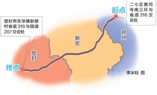 起点位于二七区黄冈寺南三环与省道316交会处,终点至登封市东华镇耿楼村省道316与国道207交会处,中间经过新密,走向大体与郑少高速保持平行,这就是即将建成的郑登快速通道。