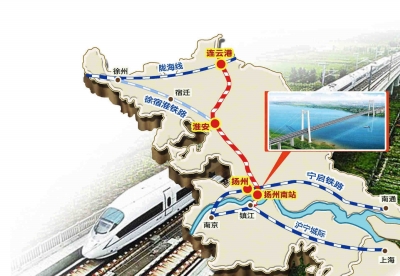 连淮扬镇铁路(扬州段):全长约130公里,设计时速250公里,设置宝应、界首、高邮、扬州四个铁路站;