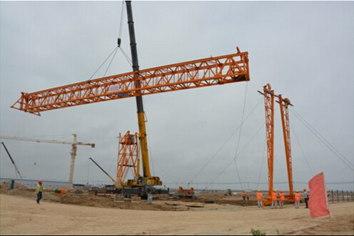 滨海项目部机械化专业公司克服困难,科学筹划、精心安排,优化吊装方案,按照施工现场的管理要求,进行特种设备的报检工作,施工方案的编、审、批和升版工作;在作业之前进行全面技术、安全交底工作,充分辨识作业过程中的危险点。安装方案采取200吨汽车吊单机吊装桥架进行就位安装工作,在所有参与作业人员的努力下,安装过程安全、顺利,圆满完成了40吨门吊的安装,为后续现场施工奠定了坚实的基础。