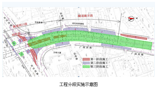 按照计划,环市西路南北两端工程分头进行,南端以隧道竖井和暗挖下穿环市西路;北侧进行车道围蔽、桥桩保护。广园西路东西两侧实施围蔽,进行立交桥的保护和隧道明挖施工,同时展开沿线管线的迁改。